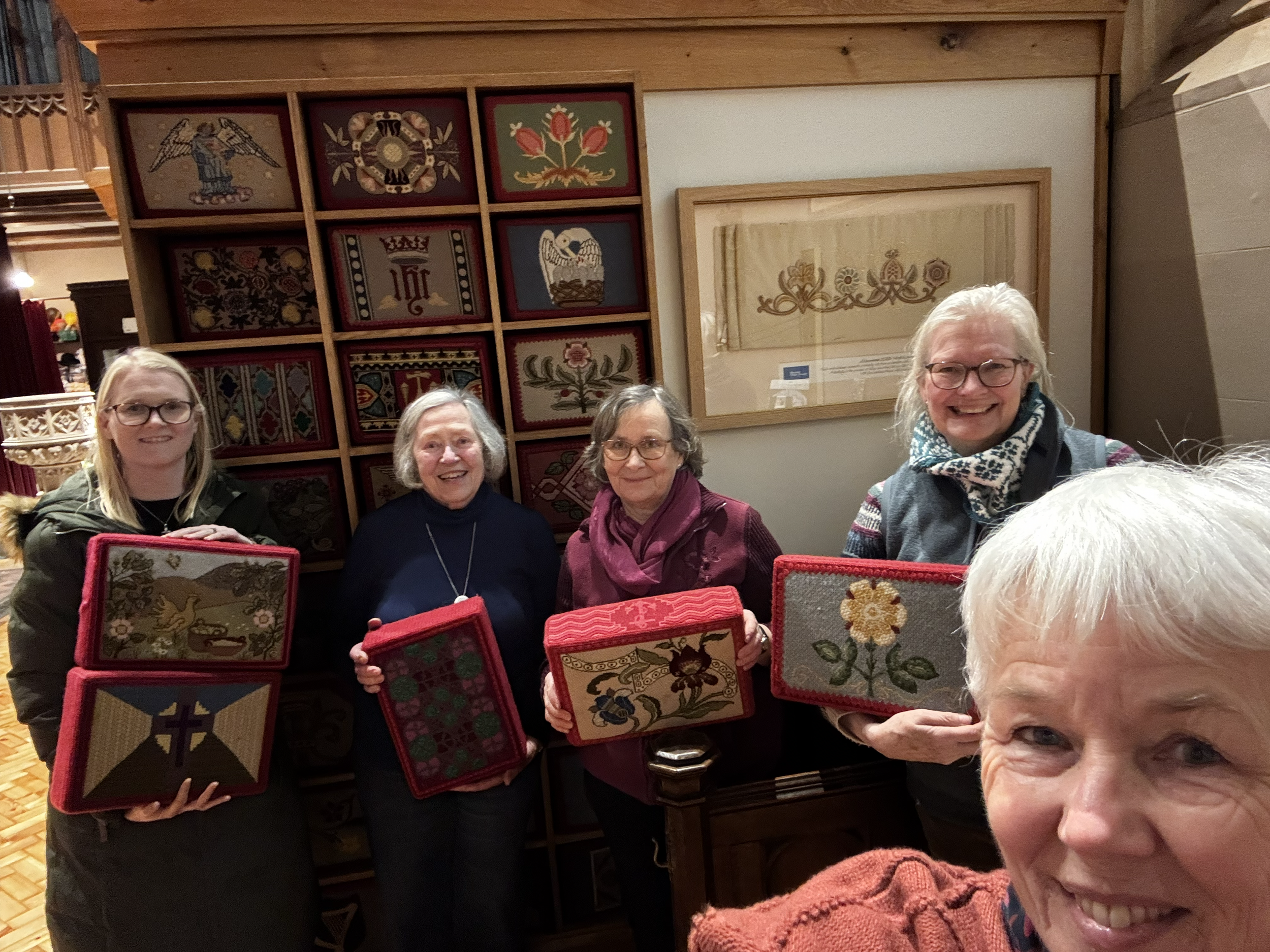 On the 5th and 12th February 2026, Dorna led a team once more to clean, scan, record and display these beautiful works of art in the church. Each kneeler was carefully cleaned, scanned and added to our records with all the details from the back, to ensure we have a record for years to come. When the labels were not visible on the back, Dorna used her logs to record the information instead.